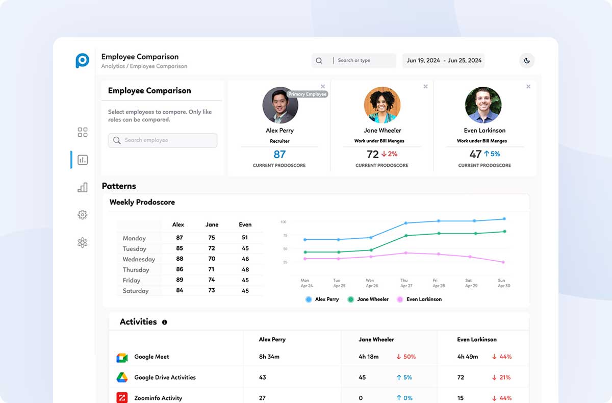 Prodoscore unifies activity data across the tools your team already uses to deliver objective, real-time employee productivity insights for data-driven people management. See true work patterns and tech adoption, coach proactively, and make confident performance decisions without tracking hours or invading privacy.