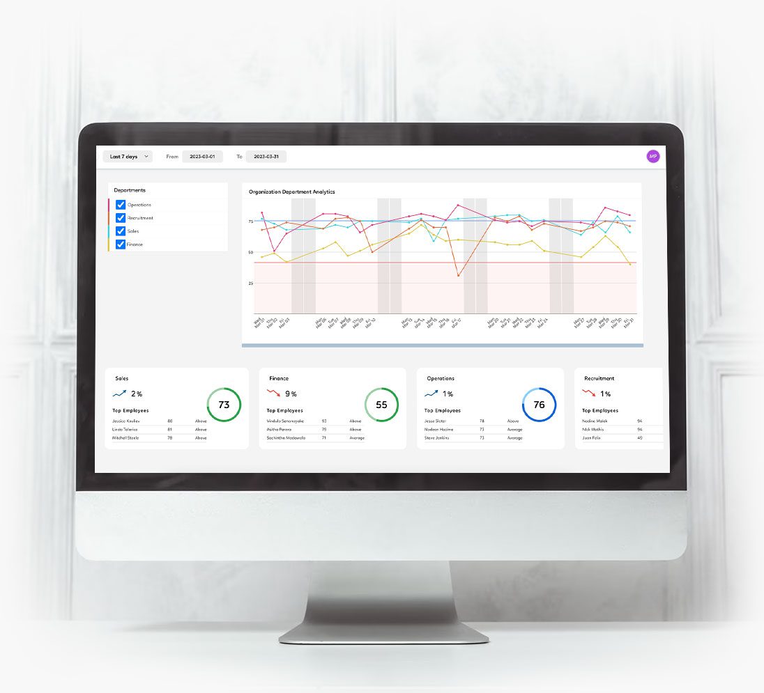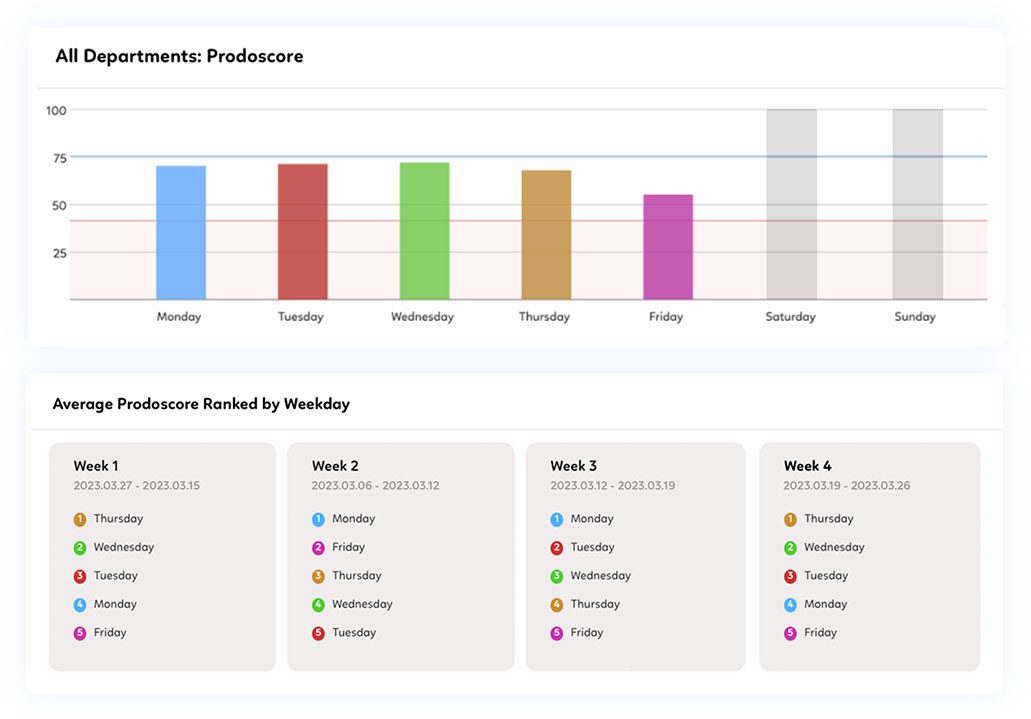 Access engagement and productivity data by department, day and location to understand daily/weekly/monthly data trends, workloads, and more.