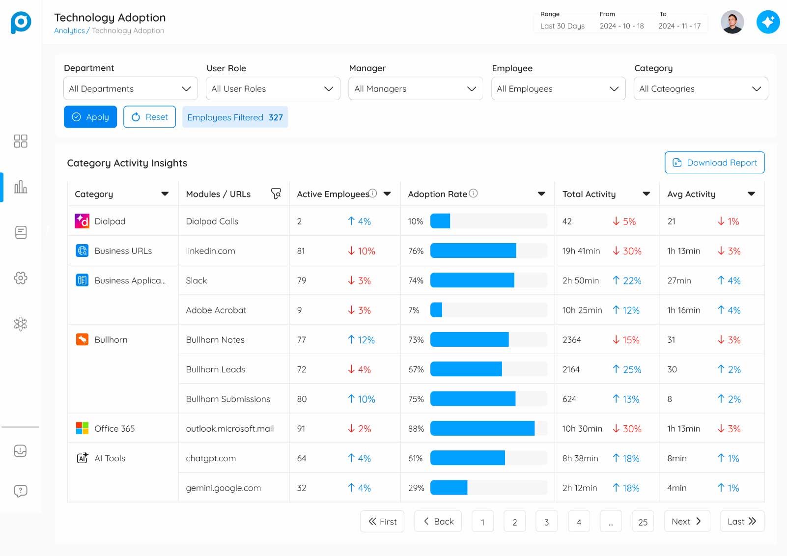 Prodoscore captures 100% of the workday, including desktop-heavy applications that web-only tools miss, and transforms that signal into an actionable Technology Adoption scorecard.