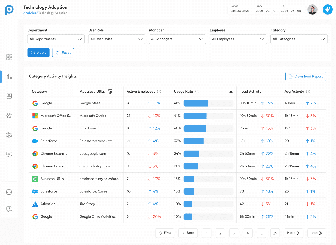 Prodoscore captures 100% of the workday, including desktop-heavy applications that web-only tools miss, and transforms that signal into an actionable Technology Adoption scorecard.