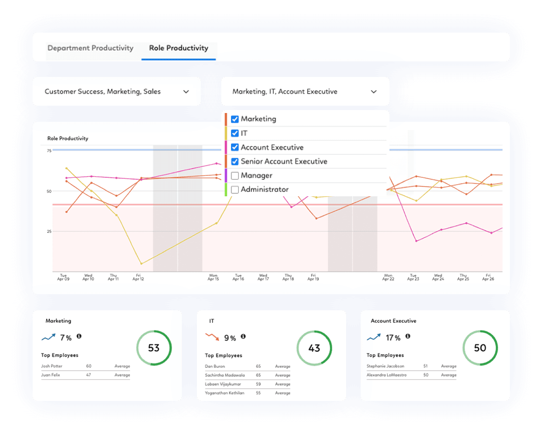 Overworked employees are often top performers; losing a top performer to burnout can seriously set a company back. Moreover, managers will have to find a way to distribute the workload among the rest of their team, potentially putting more people at risk for burnout. By highlighting who’s at-risk 6-9 weeks in advance, Prodoscore enables managers to step in before it’s too late.